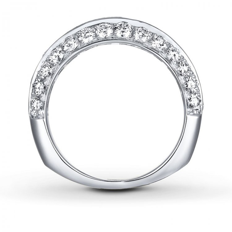 Exquisite round ideal-cut diamonds in three rows provide amazing brilliance to this anniversary band for her Independently certified by Gemological Science International, the diamonds total 2 carats in weight Crafted of 18K white gold, the band has a euro-shank for a more comfortable fit