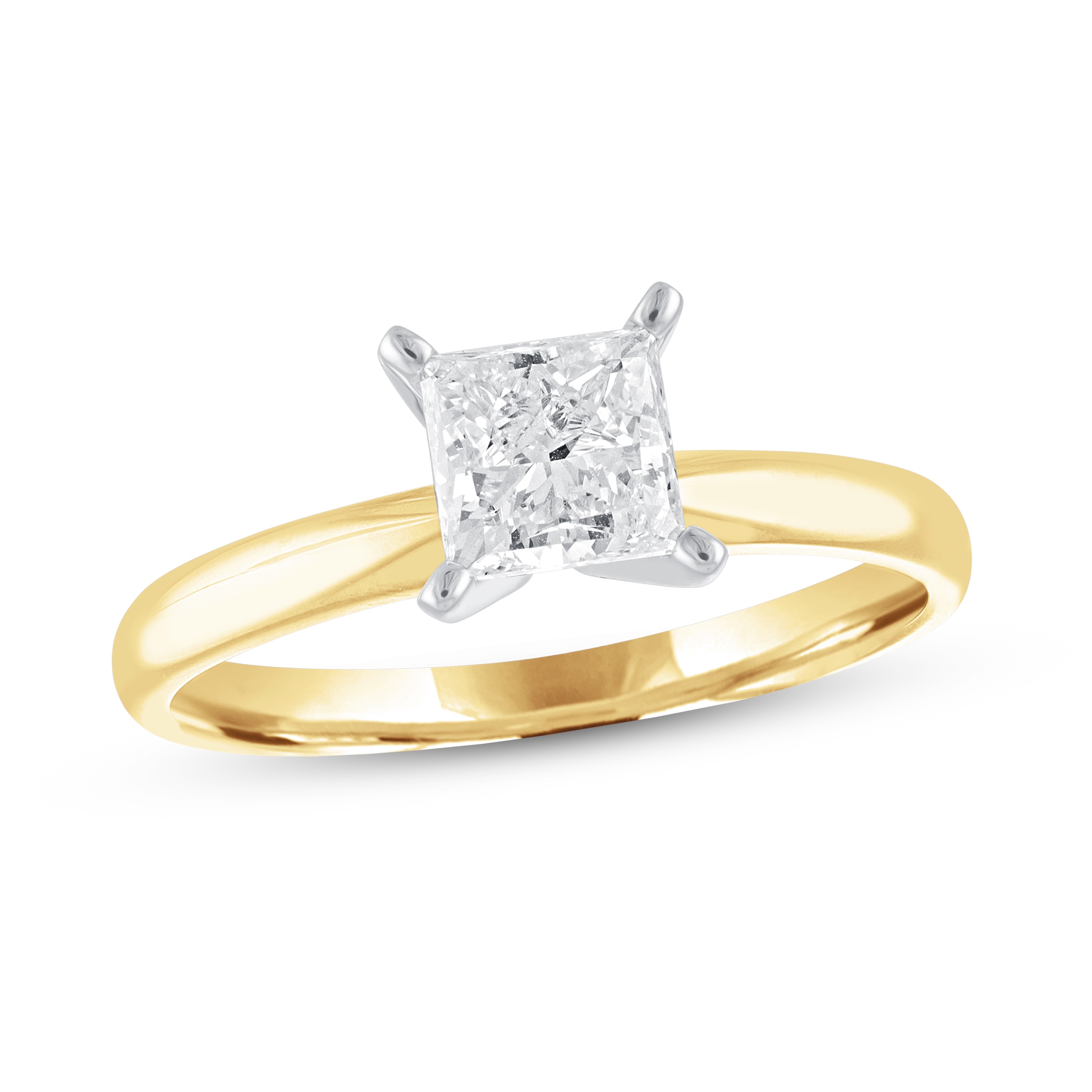 An exquisite princess-cut diamond sparkles and makes this solitaire engagement ring stand out on the gorgoeus 14K yellow gold band. The ring has a total diamond weight of 1 carat.